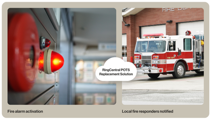 For example, when a fire alarm is triggered, the fire panel sends an analog signal to the RingCentral POTS Replacement device that converts it to Internet Protocol(IP). A Session Initiation Protocol (SIP) call is initiated through RingCentral to transmit emergency tones and signals. This notifies the local fire responders, ensuring prompt emergency response. RingCentral POTS Replacement helps protect your existing investments while streamlining management and reducing costs.