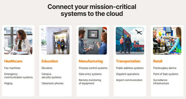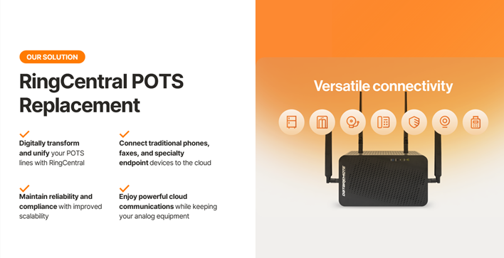 RingCentral POTS ( Plain Old Telephone Service ) Replacement solution connects traditional phones, fax machines, and specialty endpoint devices, including emergency alarms, point-of-sale systems, and security systems, to the cloud.